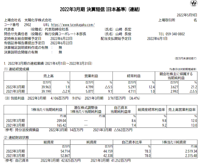 太陽化学(2902)が2022年3月期決算を発表しましたので、ざっくりと確認しました。