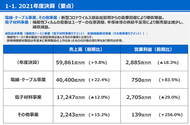 電線・ケーブル事業は、コロナ禍からの需要回復により増収増益となりましたが、利益柱の電子材料事業が減収減益と振るいませんでした。顧客の在庫調整や半導体の供給不足で、機能性フィルムの販売量が減少したとのことです。電子部品セクターは全般に好調な環境であり、減益なのは「アレ?」という感じですが、タツタ電線の製品はスマホ需要に特化しているのが影響している感じですかね。
